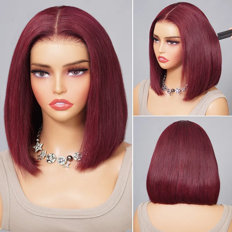 Burgundy 99J Color Short Bob Straight Human Hair 6×5 Glueless Lace Closure Wigs