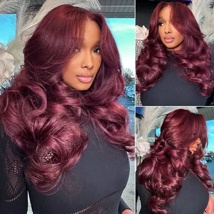 35 reviews for Pre Styled Butterfly Layered Cut Loose Body Wave Dark Burgundy Color 6×5 Glueless Closure Wig 250% Density